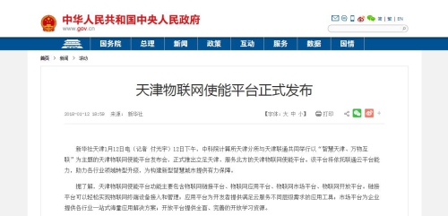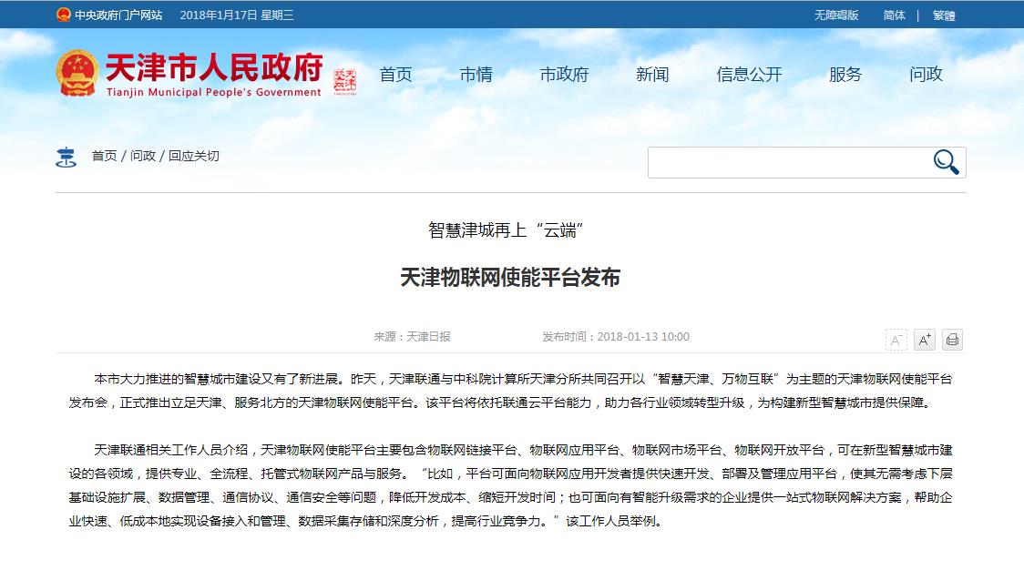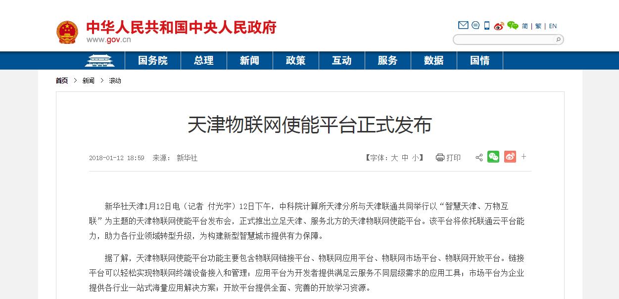 1月12日下午,中科院计算所天津分所与天津联通共同举行以“智慧天津、万物互联”为主题的天津物联网使能平台发布会,正式推出立足天津、服务北方的天津物联网使能平台。该平台将助力各行业领域转型升级,为构建新型智慧城市提供有力保障。天津物联网使能平台的发布获得了社会各界的高度认可,发布首日荣登中华人民共和国中央人民政府官方网站、天津市人民政府官方网站的新闻首页。