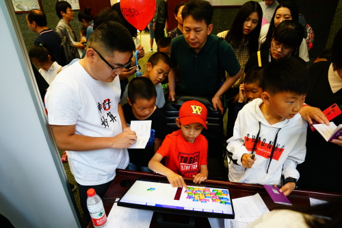 有家长带着孩子在进行“解密开宝箱”游戏,二进制、十进制、1024、斐波那契数列、超级计算机模拟体验等环环相扣的解密过程,好玩又益智,即有趣又学了知识,连续打开藏在“游乐场”各处的五个宝箱,不光能等到一本“神计妙算”宝典,还能得到“解密高手”的荣誉称号,排队开宝箱的队伍一直都是最长的。