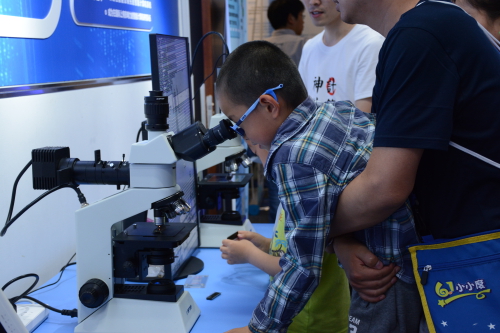 “与芯片合个影”带领公众探索芯片的内部世界,了解芯片的制作流程,公众通过显微镜放大芯片并合影留念。