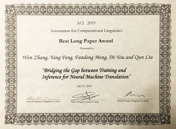 在7月29日-31日召开的2019年ACL大会上,来自中国科学院计算技术研究所自然语言处理团队的论文《Bridging the Gap between Training and Inference for Neural Machine Translation》获得了大会唯一的最佳长文奖,这也是国内单位首次获得ACL最佳长文奖。这一工作是由我所冯洋、刘群老师指导学生张文等完成。其他作者中,孟凡东是从这一团队毕业的学生,游狄是在这一团队工作过的实习生。