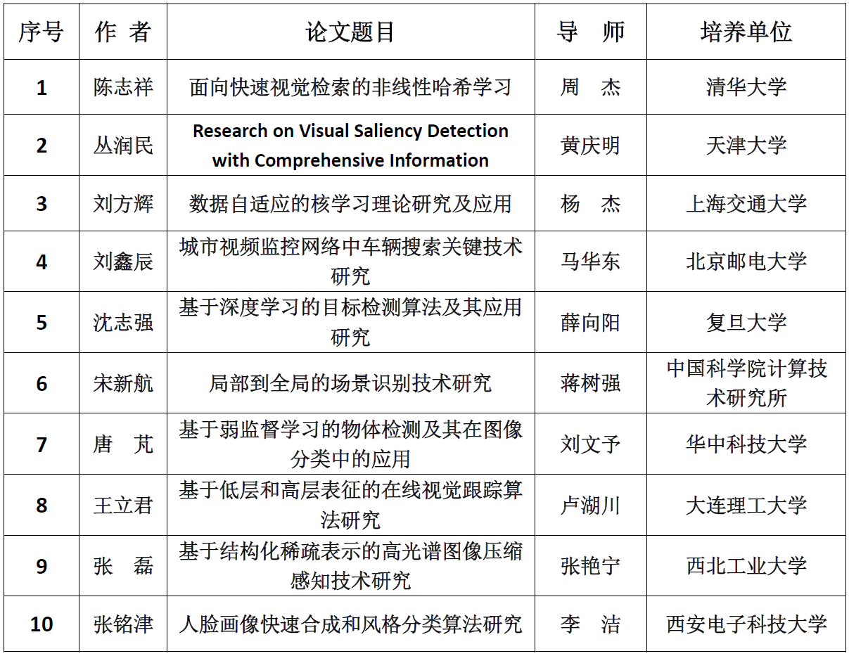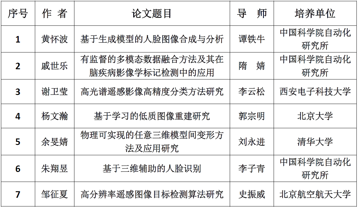 2019年度“CSIG优秀博士学位论文奖”获奖名单