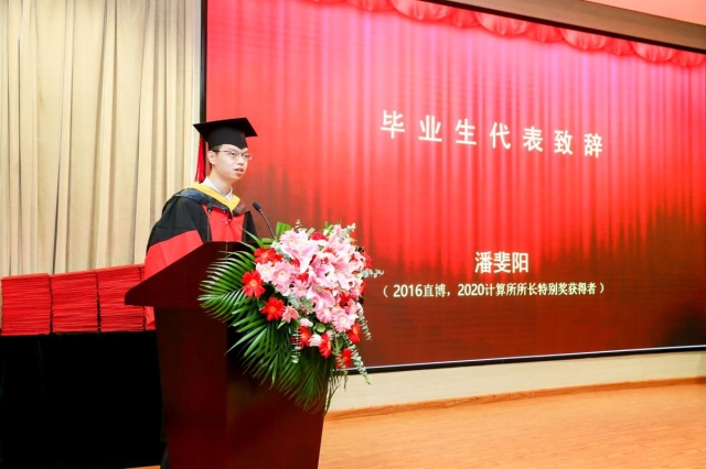 计算所所长特别奖(夏培肃奖)获得者博士生潘斐阳代表全体毕业生发言,他分享了自己读博期间的学习生活,表达了对研究所、导师和同学的感恩与不舍,并表示将与全体毕业生一起砥砺奋进,利用所学服务国家发展和社会进步。