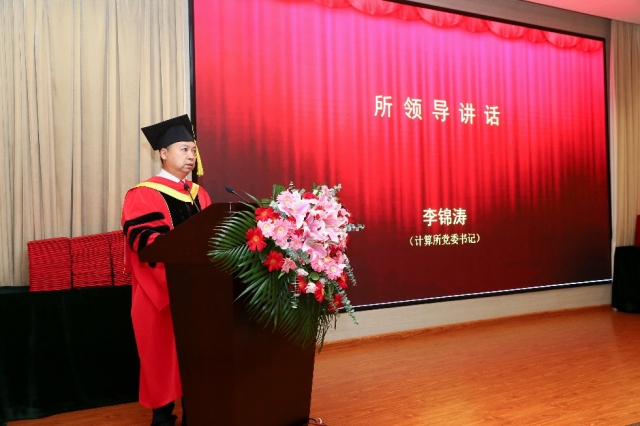 典礼在雄壮的国歌声中拉开帷幕。计算所党委书记李锦涛首先致辞。他回顾了计算所发展历程,老一代计算所人筚路蓝缕,实现了国内计算机技术发展多项重大突破。如今计算所作为我国重要的计算机高端人才培养基地,肩负着社会发展和民族振兴的重任。最后他叮嘱同学们要牢记“科研为国分忧,创新与民造福”使命信念,为中华民族的伟大复兴贡献自己的力量。