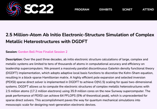 中国科学院计算技术研究所处理器全国重点实验室副研究员贾伟乐、博士生郭卓强及其导师谭光明研究员提出并实现了目前世界上效率和速度最高的大规模稀疏矩阵并行算法,在国产“神威-海洋之光”超级计算机上获得了64PFLOPS峰值(5%的峰值效率),并与中国科学技术大学,崂山实验室(原青岛海洋科学与技术试点国家实验室),北京大学、中科院软件所、齐鲁工业大学、国家并行计算机工程技术研究中心等单位合作,推动科学家首次完成了250万原子的复杂金属异质结从头计算(ab initio calculation)模拟,相比国际同类工作,其计算速度提高三个数量级。该工作在领域专用稀疏矩阵求解器上迈出了重要一步,为后E级超级计算机软硬件协同提供了新的思路。成果以合作论文(郭卓强共同一作、贾伟乐共同通信作者)”2.5 million-atom ab initio electronic-structure simulation of complex metallic heterostructures with DGDFT”为题进入2022年国际计算机学会戈登贝尔奖入围名单(链接:https://sc22.supercomputing.org/presentation/?id=gb105&sess=sess191)。