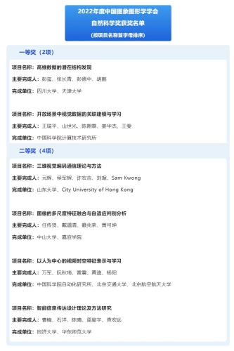 根据《中国图象图形学学会科学技术奖章程》和《中国图象图形学学会自然科学奖评选条例》相关要求,中国图象图形学学会于2022年6月启动了2022年度科学技术奖的评选工作。经形式审查、初评、公示、终评等程序,共评选出自然科学奖6项,其中一等奖2项,二等奖4项。
