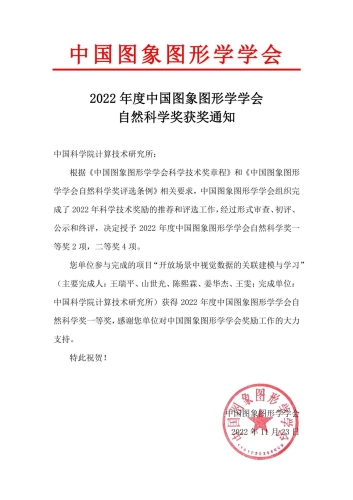 11月23日,2022年度中国图象图形学学会科学技术奖评选结果正式公布,中国科学院计算技术研究所智能信息处理重点实验室完成的项目“开放场景中视觉数据的关联建模与学习”(主要完成人:王瑞平、山世光、陈熙霖、姜华杰、王雯)荣获自然科学奖一等奖,在此热烈祝贺项目团队!