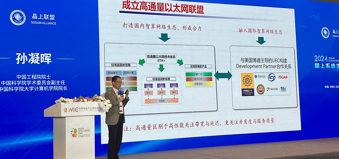 2024年6月21日,在天津举办“2024世界智能产业博览会”同期活动 “2024晶上系统生态大会”上,中国工程院院士、中国科学院计算技术研究所(以下简称“计算所”)孙凝晖研究员对外介绍了中国首个高通量以太网联盟(ETH+ Consortium)最新进展。
